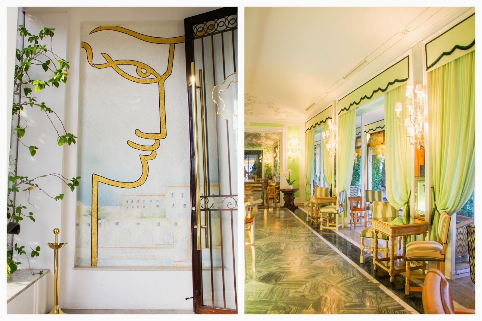 Changement d’époque et retour sur la Riviera pour comprendre peut-être d’où me vient cette envie folle de marbre vert, de métal doré et de cocktails … Je vous emmène prendre un verre au très chic bar de La Voile d’Or à Saint-Jean Cap Ferrat … La Voile d’Or est le plus vieux palace de la presqu’île et la déco actuelle doit dater des années 60 … Amicalement Votre, vous vous souvenez !!! Mais un beau 60, luxueux, feutré, ensoleillé et kitchy comme on pourrait le qualifier aujourd’hui … Un havre de paix qui traverse le temps avec des rides mais tellement charmantes ces rides qu’on se plait à espérer que jamais cet endroit ne changera … Un French Martini* jeune homme s’il vous plait !
