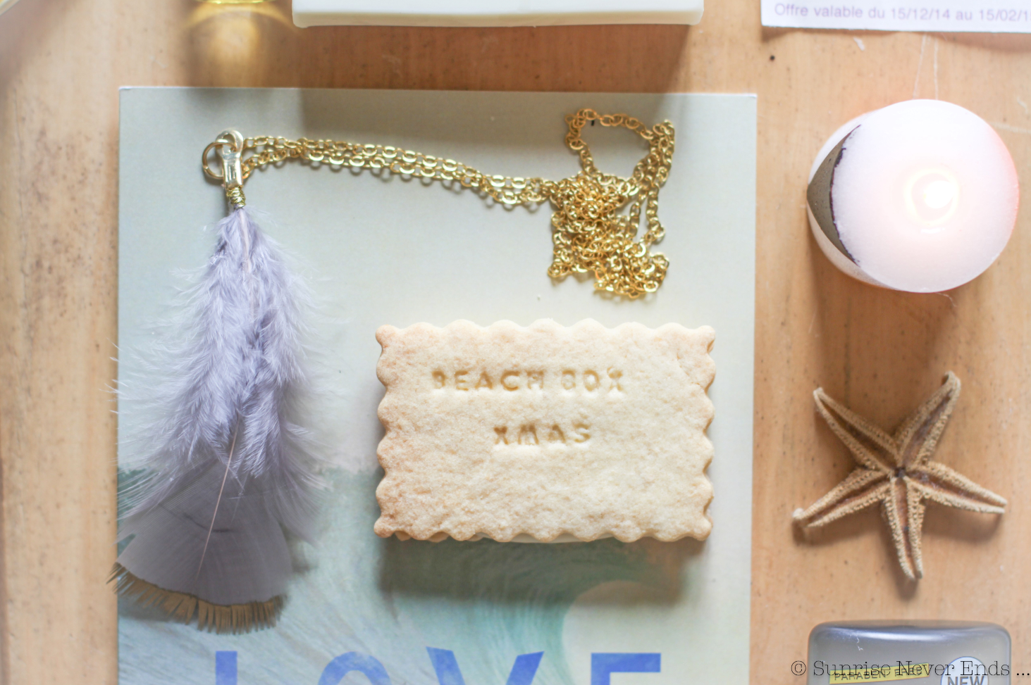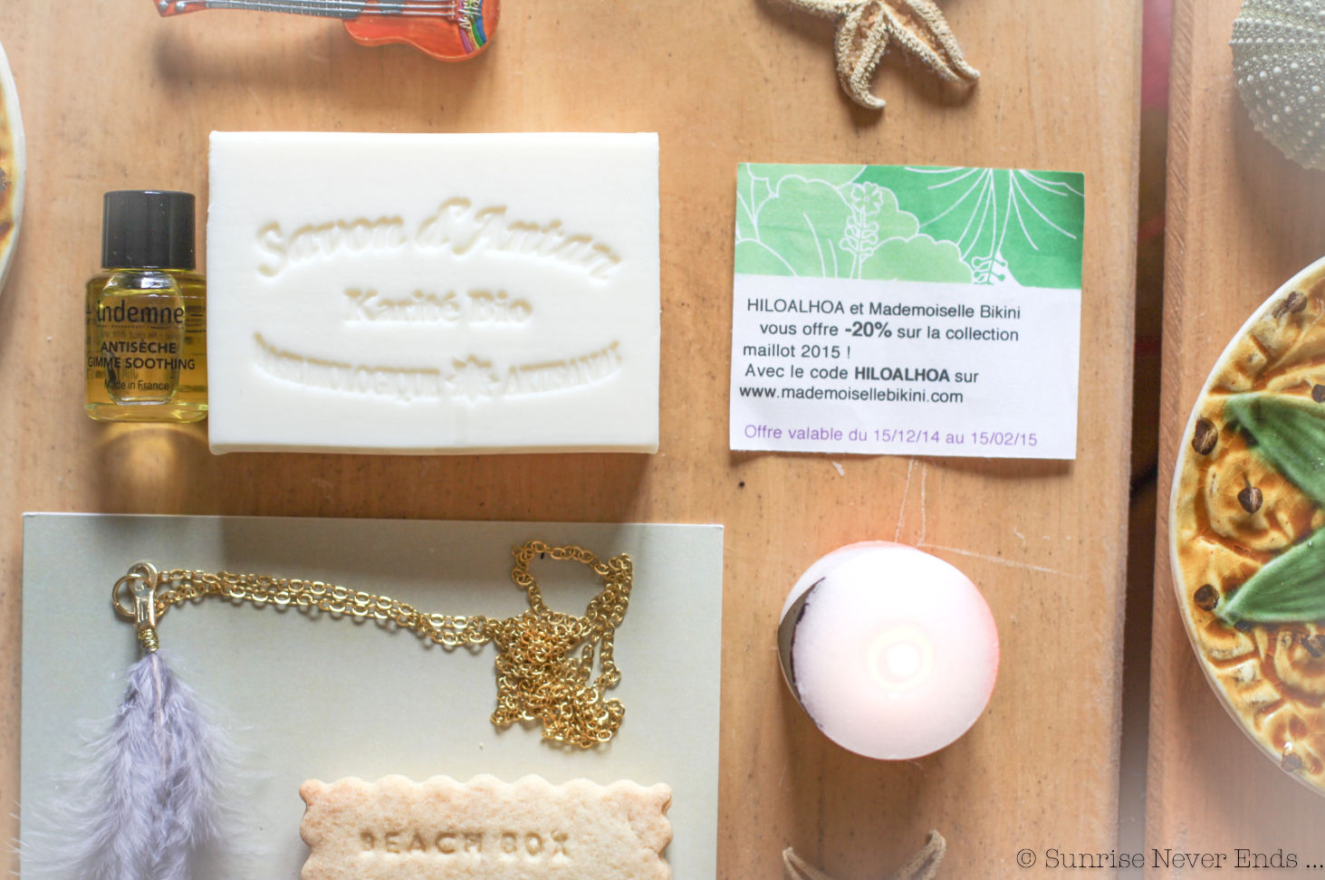 Un bikini Picture Organic Clothing pour que votre iphone (promis, le truc débile qui rendra jalouse toutes vos copines!) se sente lui aussi en mode Braaaazil …. Un savon de La Savonnerie de la Drome au karité bio pour prendre soin de votre peau et éviter l’effet crocodile au retour des beaux jours … Un sautoir plume Guava and Coconut car n’oublions pas que l’une des Madames Beach Box est avant tout Mme Beach Plumes … Une carte postale pour déclamer vos voeux de Noël (ou toute autre déclaration d’amour …) … Un stick solaire qui sent trop bon Seventy One Percent pour vous protéger des effets nocifs du soleil (ok quand il reviendra pour de vrai !) … Une huile Indemne 100% naturelle pour que votre peau reste belle et hydratée même en sortant de l’eau en plein hiver (ok même sans sortir de l’eau en plein hiver !!!), une micro bougie faite avec amour, un bon de réduction de 20% d’ors et déjà valable sur le site Mademoiselle Bikini sur la collection Eté 2015 de maillots de bains (peau hydratée & stickée d’écran protecteur, vous êtes prêtes pour le maillot naaannnn ????!!!!) et enfin un succulent double biscuit au chocolat blanc de Shanty Biscuits (pour commencer à ruiner vos espoirs de bikinis …) …