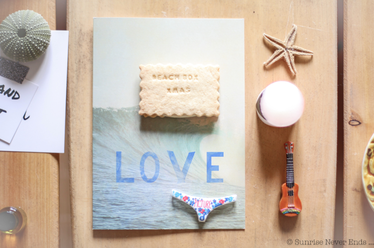 Je sais, je sais, déjà vous vous sentez mieux rien qu’à l’énoncé de ce nom et déjà vous avez moins froid, vous sentez les effluves de Monoï qui se dégagent de la box, le chocolat blanc du délicieux biscuit dédicacé vous chatouille les narines … Bref, La Beach Box réveille nos sens engourdis par le froid et la grisaille et nous entraine d’ors et déjà vers l’été et le soleil !!!