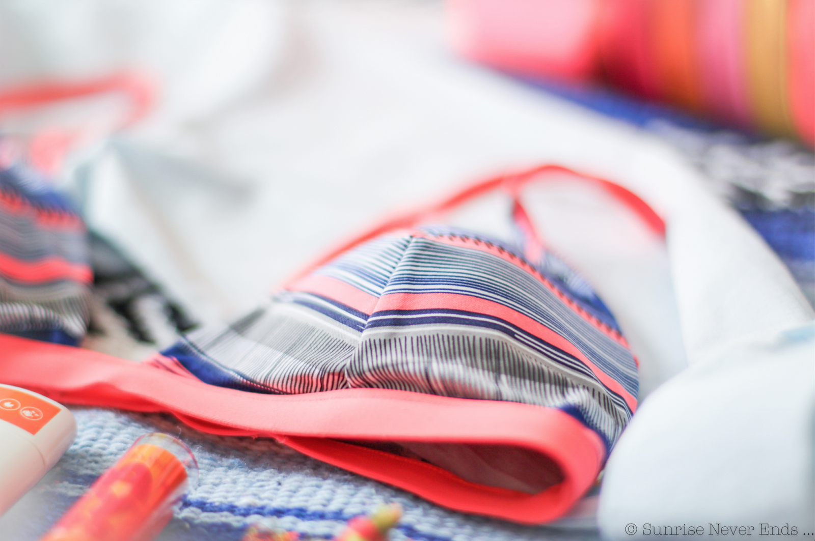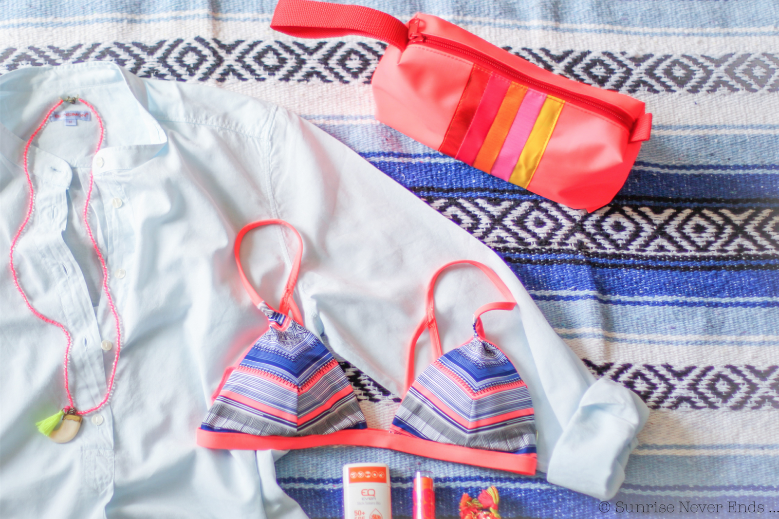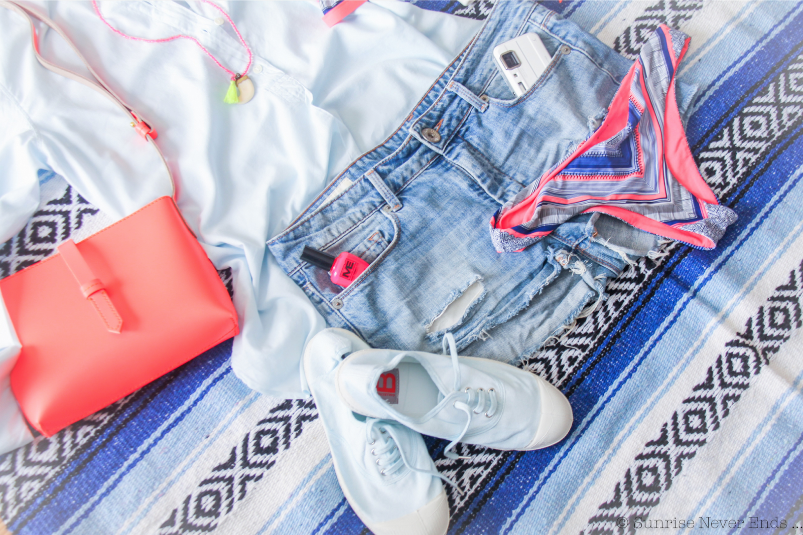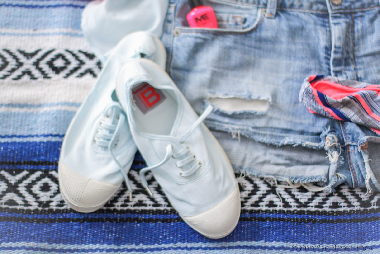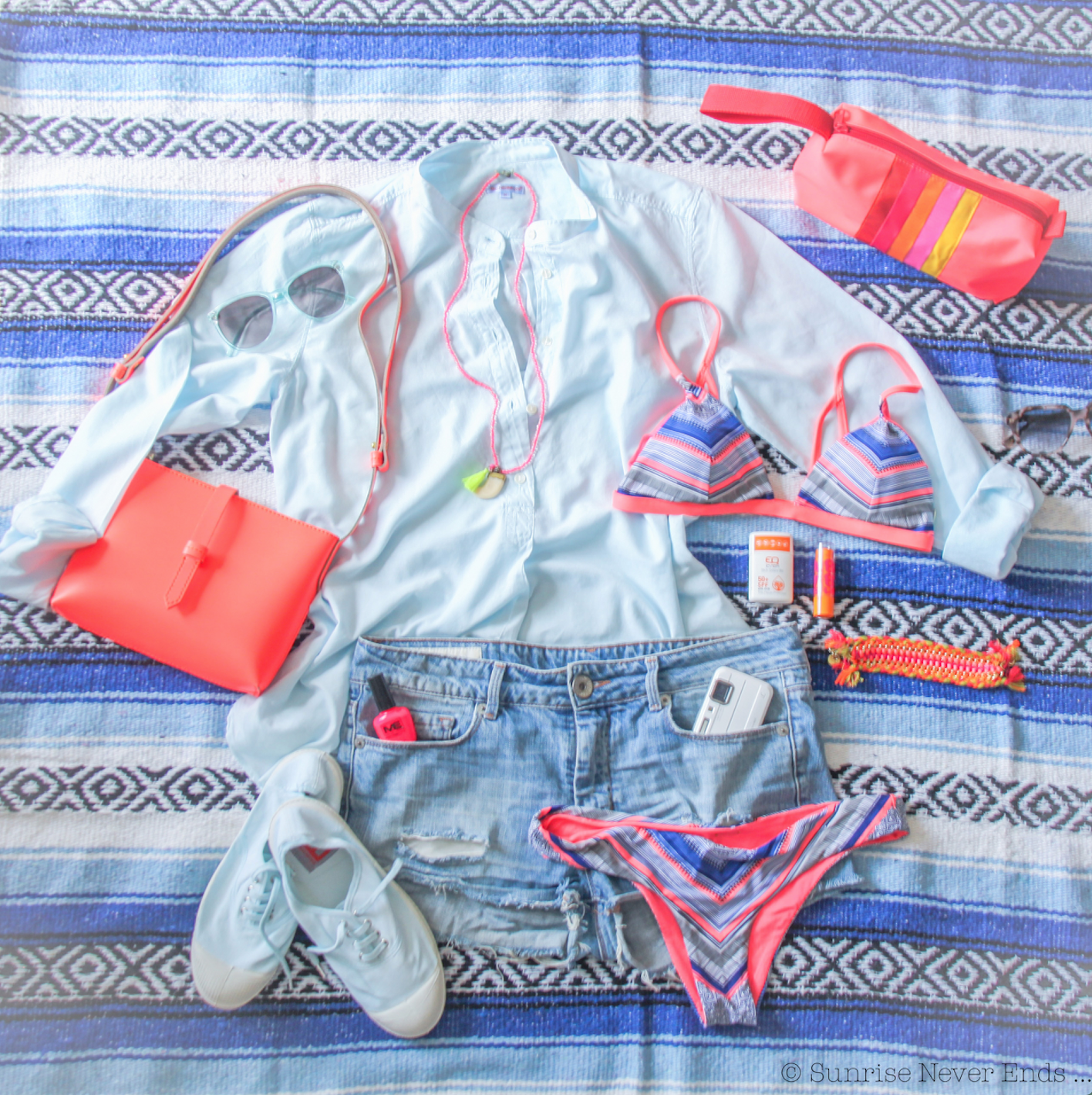 Chemise en voile de coton et Tennis bleu pale Bensimon … Maillot de Bain Rip Curl … Short vintage … Sac en cuir fluo JCrew … Pochette en nylon Maison Lasserre … Lunettes D.Blanc … Collier Mönik … Stick Solaire EQlove … Couverture mexicaine AmenMadeinMexico …
