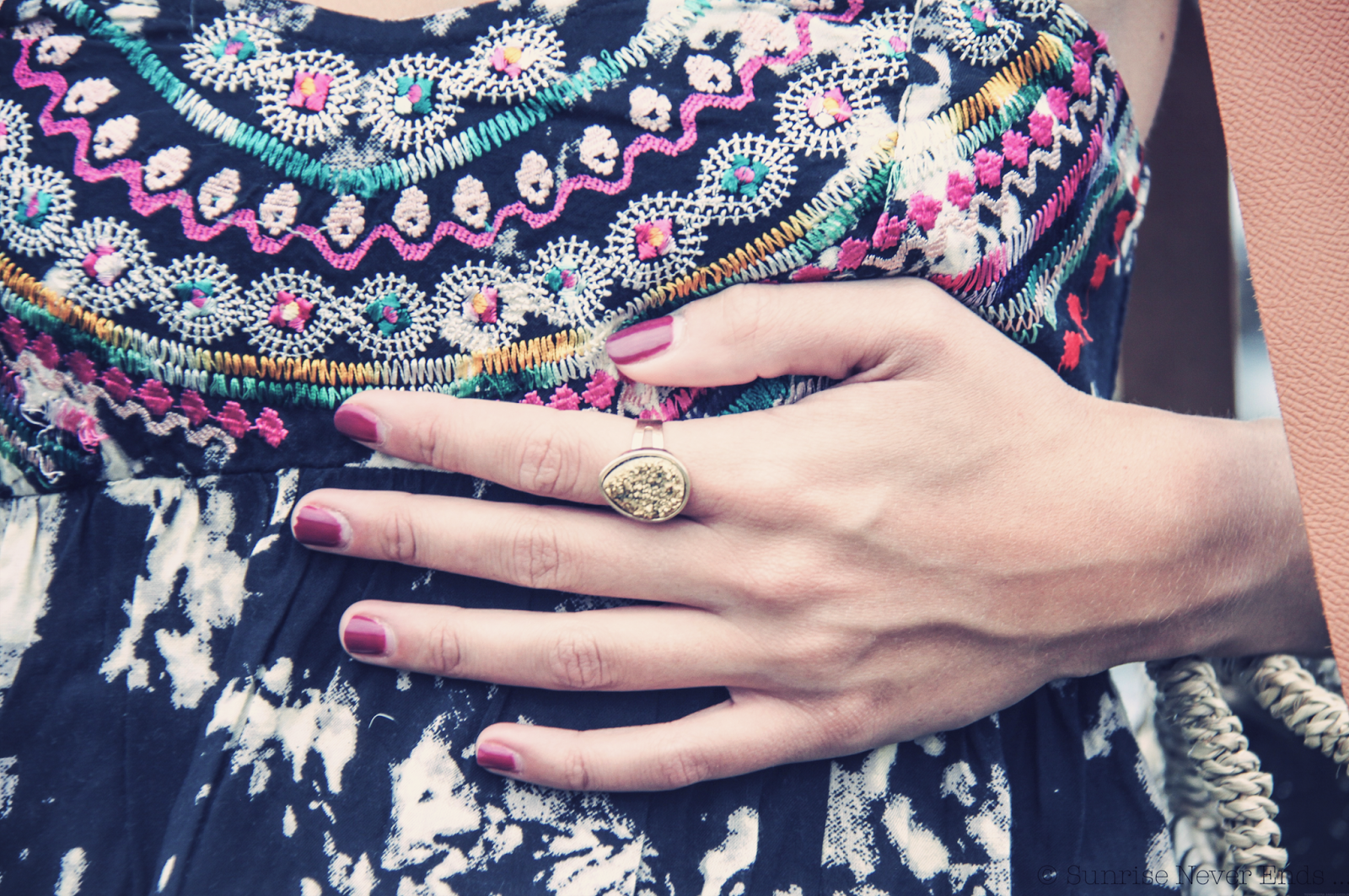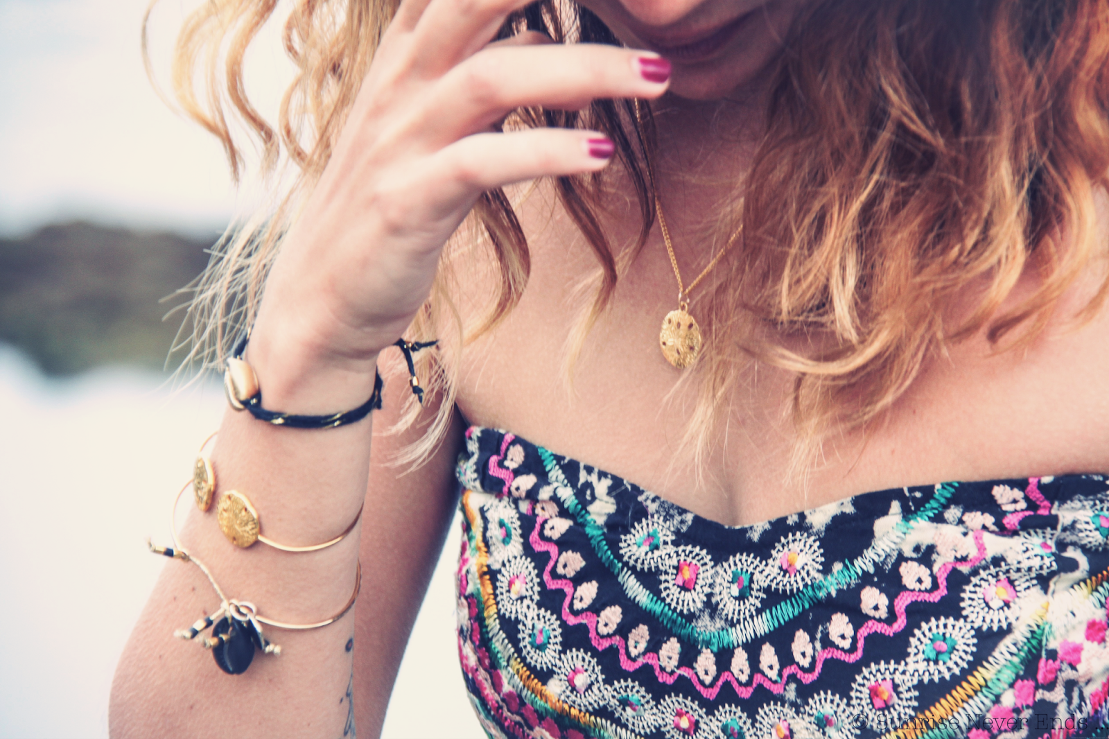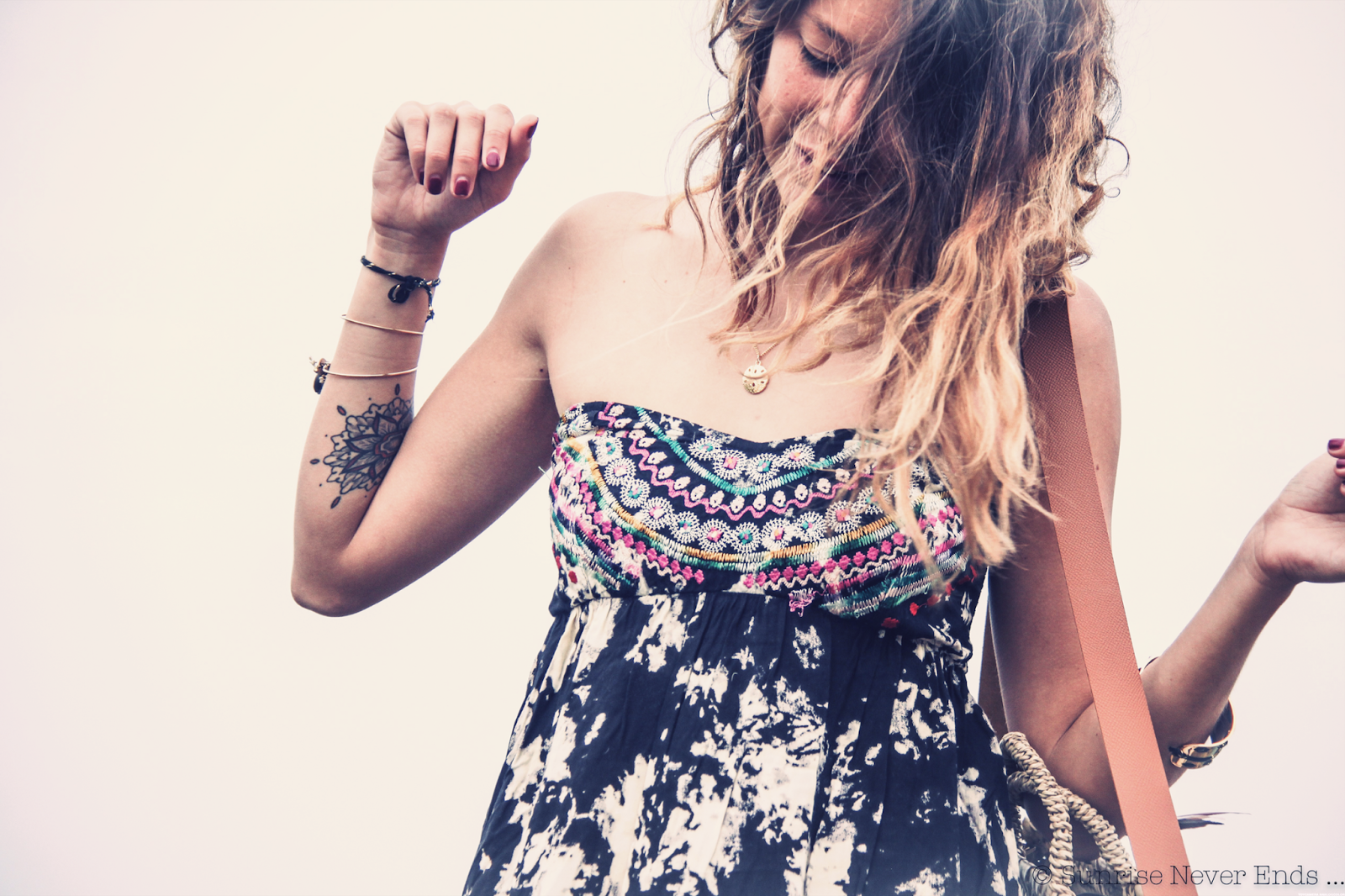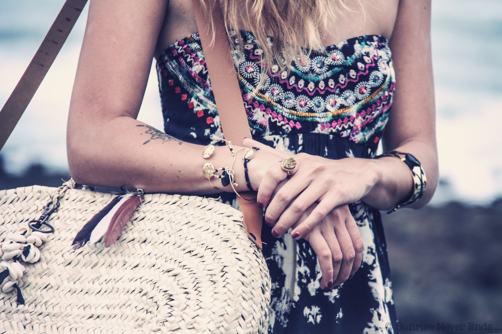 A la plage, il ne fait pas toujours beau, preuve en est de ce shooting … Mais ce n’est pas parce que le ciel est gris que les températures ne sont pas clémentes pour autant !!! Alors histoire de matcher à ce cloudy mood, nous avons craqué pour cette robe longue tye and dye, boho à souhait … Un haut bustier brodé ethnique et une longueur au sol évasée, un combo parfait pour chiller tranquillement les jours d’été, à la plage, en ville ou pour faire son marché … Et qui dit marché dit panier ! Je vous avais déjà montré ce nouveau panier de Sathyne que j’avais en avant-première lucky me !!! embarqué avec moi à Saint-Jean Cap-Ferrat à l’automne dernier … Voici sa version ethnique chic qui s’accorde avec les bijoux d’inspiration africaine de Christelle qui eux-mêmes s’accordent à merveille à cette robe noir & blanc … Bref la boucle est bouclée, tout s’accorde !!! #lavieestbelleàlaplage …