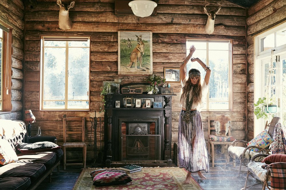 Puisque l’été s’en est allé, c’est donc officiellement l’automne l’été indien qui s’installe maintenant … Je préfère appeler cette saison l’été indien ainsi c’est l’esprit de l’été qui demeure encore un peu, l’automne m’inspirant plus des feuilles mortes que la chaleur en pente douce … Mais quoi qu’il en soit, je ne peux m’empêcher, surtout cette année où la chaleur se fait la malle plus vite que prévu, d’avoir de nouveau envie de couleurs plus chaudes (justement!), rassurantes, enveloppantes … Je recommence à penser à la déco intérieure de la maison, à en changer les tonalités, à en réchauffer les matières, à repenser bois, kilims, fourrure et nouvelle couverture en crochet … Choisir des laines, des tapis, des mailles moelleuses à enfiler le matin, des plaids dans lesquels il fera bon se lover d’ici quelques temps, des plantes qui donneront à la maison sa touche green même en plein hiver, des macramés pour accrocher ces plantes (forcément!), des coussins qui apporteront leur dose ensoleillée d’ethnique et des beaux livres pour rêvasser lors des longues soirées d’hiver au chaud sous ma couverture en crochet … Bref dans cet esprit, je trouve ce shooting des plus inspirants car ici, comme le dit si bien Steven Burke We live in the woods next to the beach …