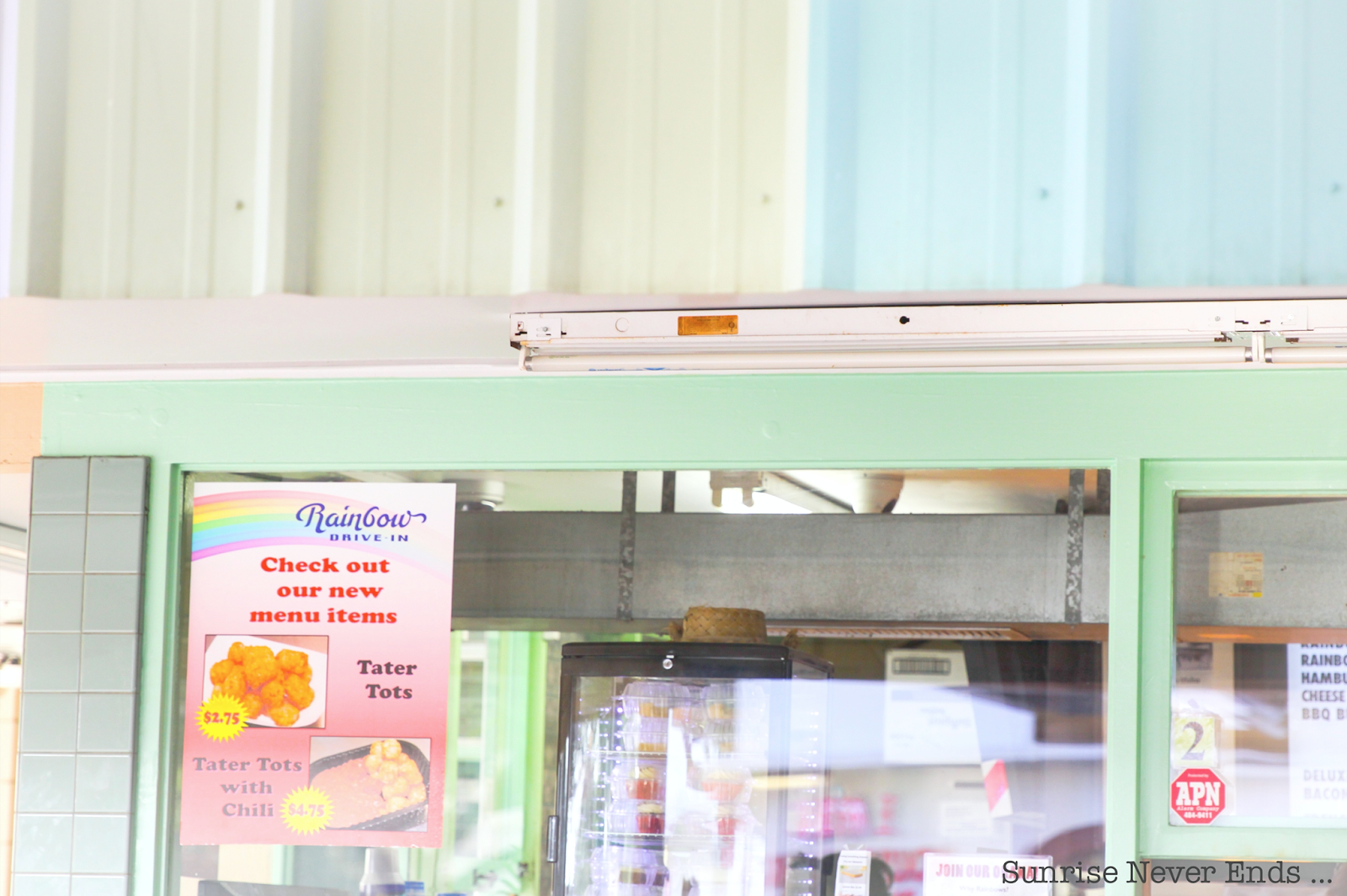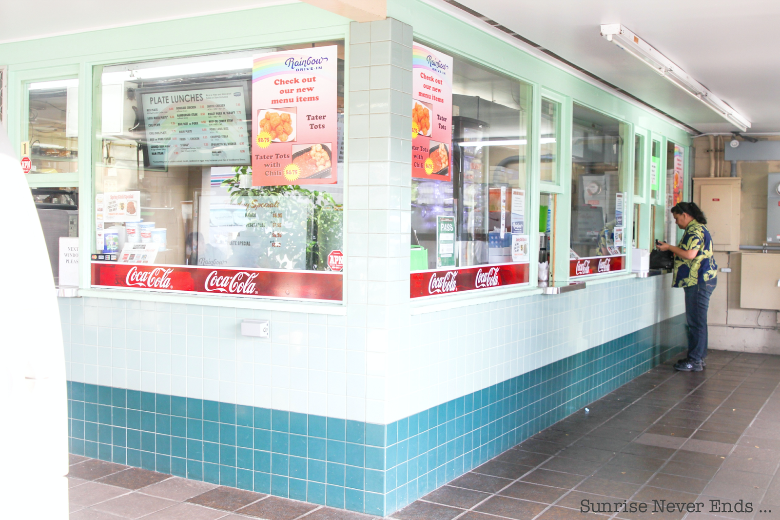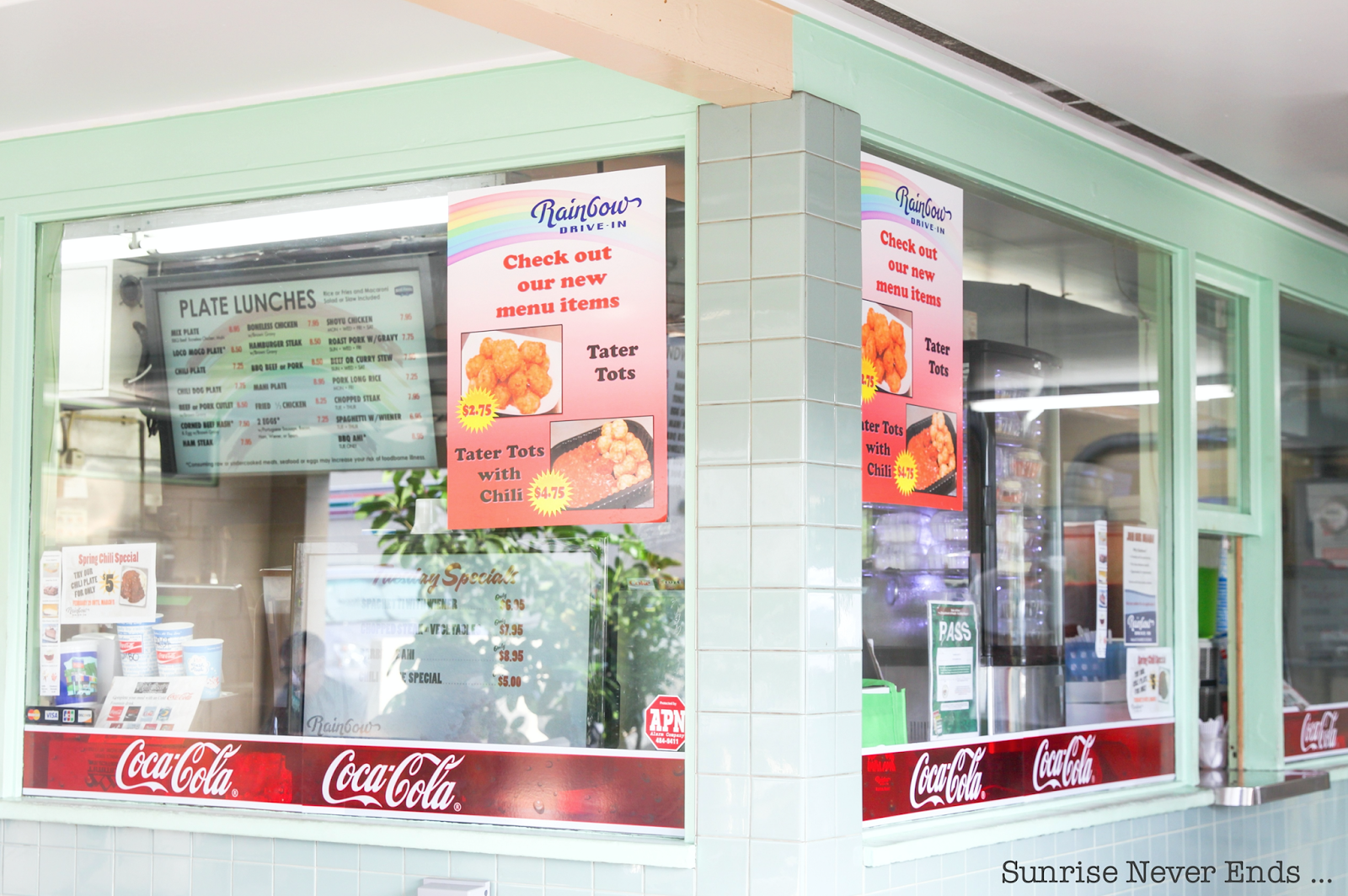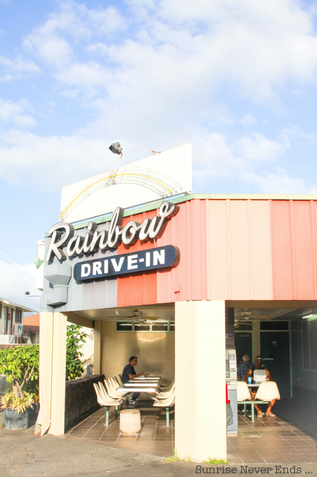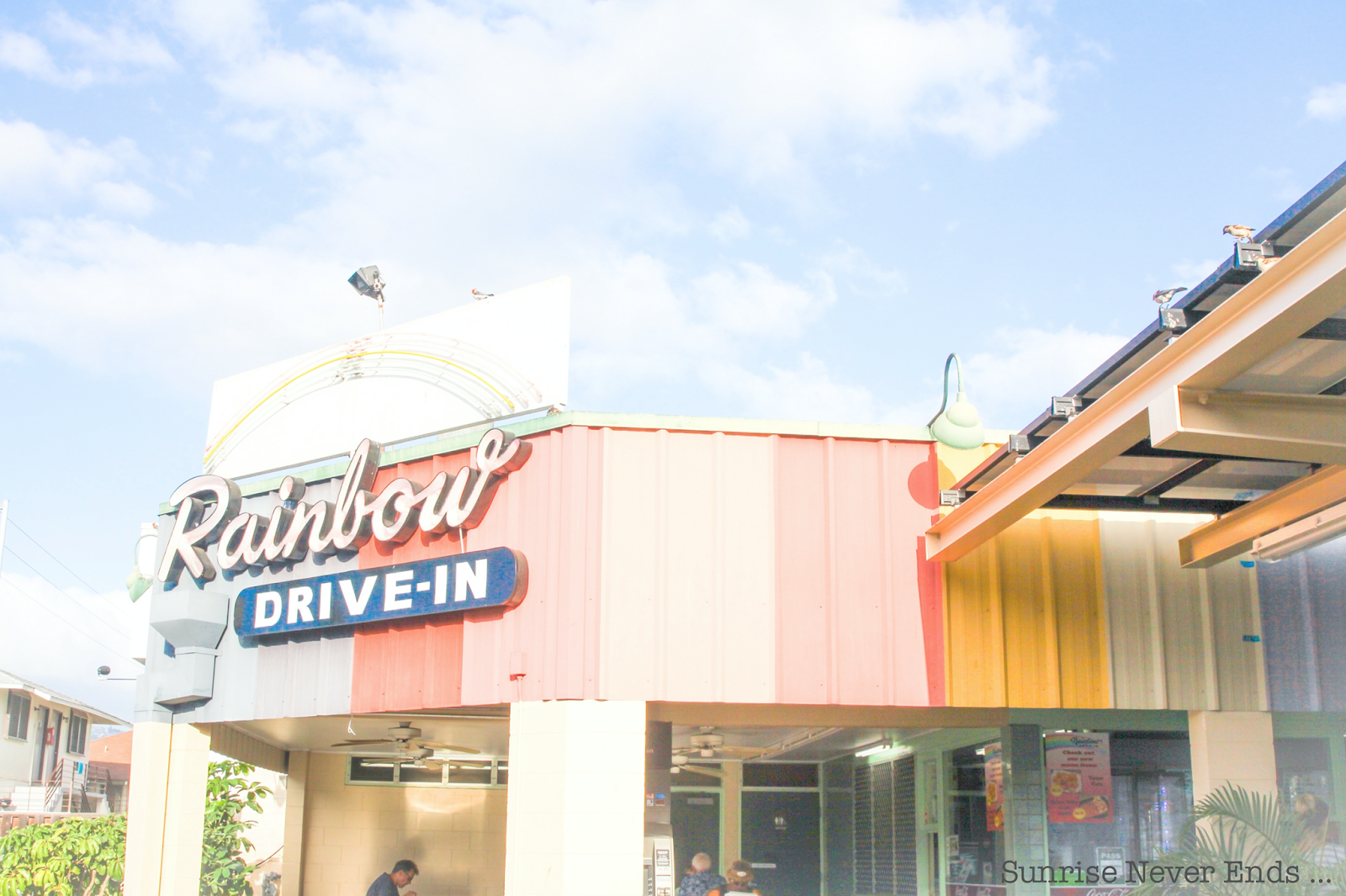 Une petite faim après le shopping ??? J’avais entendu parler de cet endroit comme étant un restaurant de locaux, plutôt populaire, aux portions généreuses pour des prix modiques … Situé à Honolulu mais loin des plages touristiques de Waikiki, cet endroit m’attirait surtout pour sa déco 60’s dans son jus et ses couleurs acidulées !!! Le Rainbow Drive-In porte bien son nom et on peut effectivement y satisfaire une fringale pour quelques dollars ! Par contre ici, pas de vegan, gluten-free blablabla, on revient aux sources de la gastronomie américaine pur calories !!! Mais que c’est bon parfois !