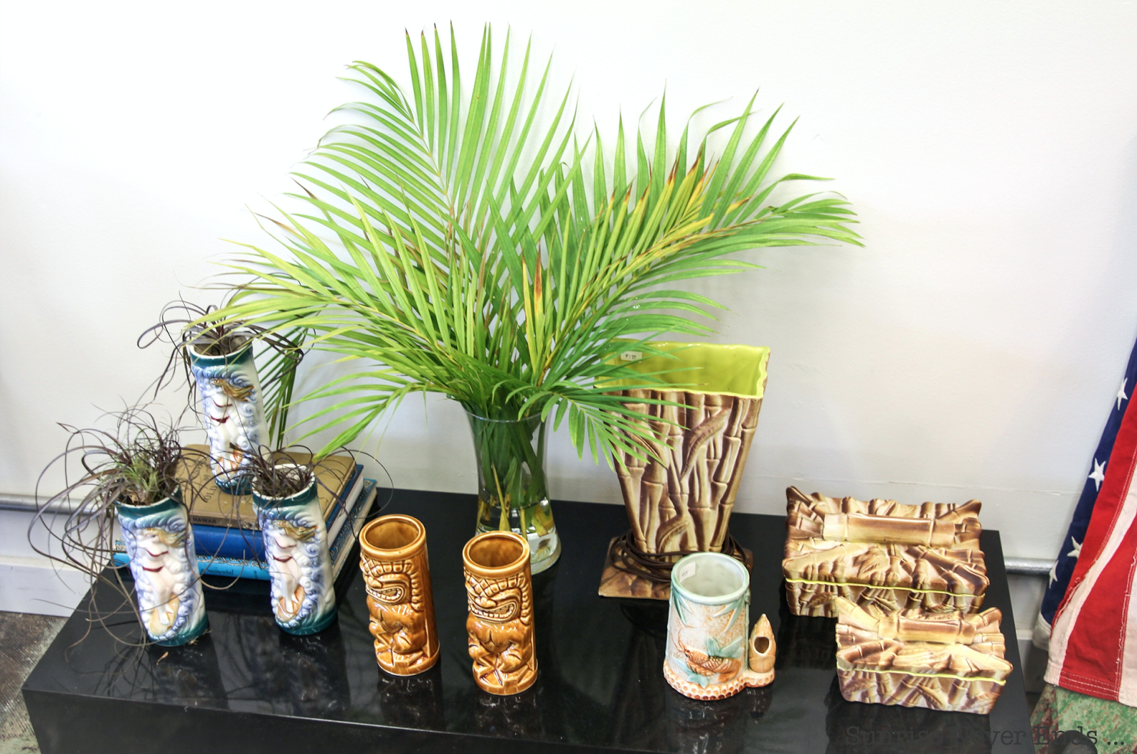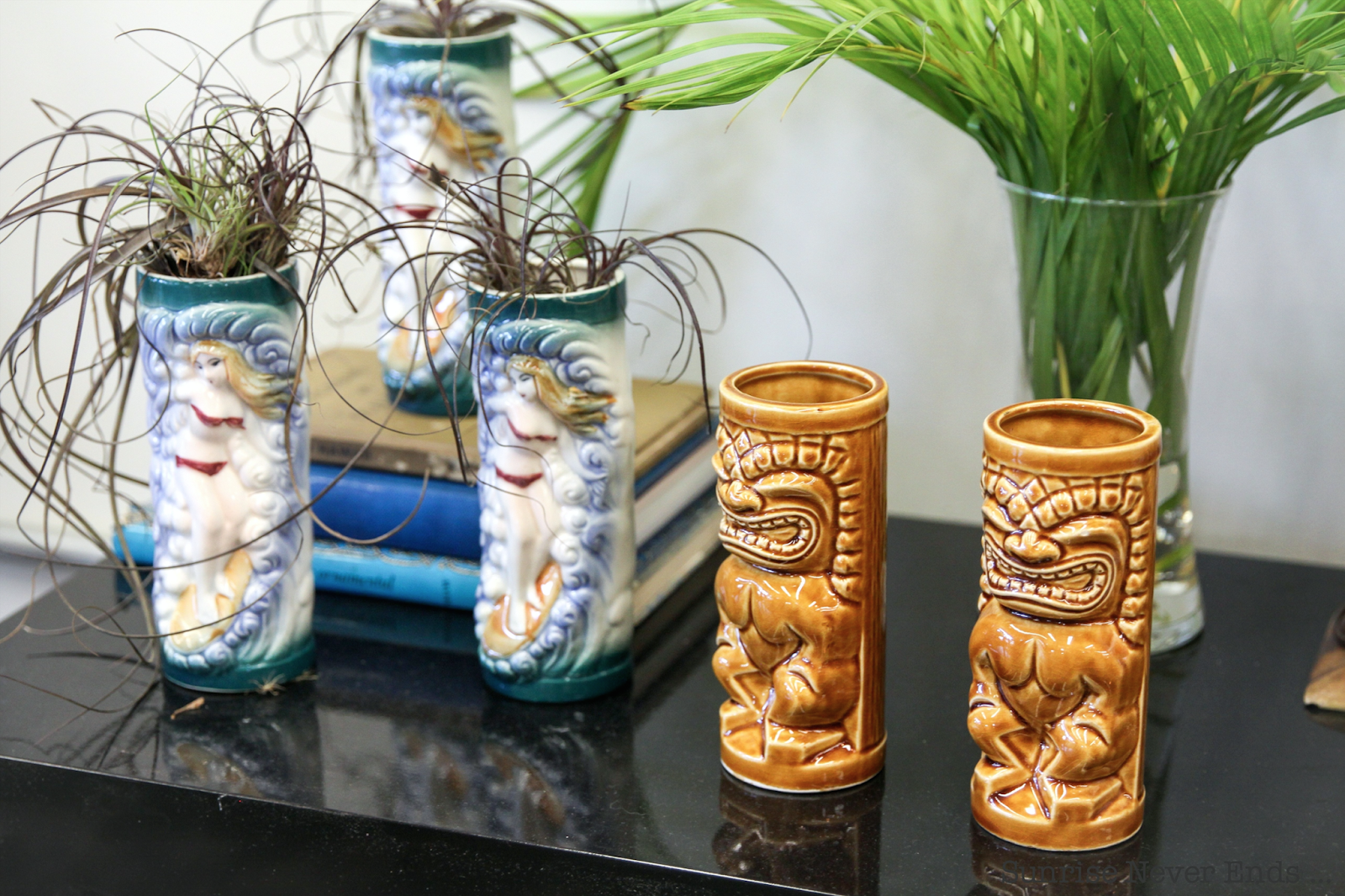 Mais surtout, à défaut de pouvoir tout acheter et tout ramener sans casse, je me suis inspirée de leurs mises en scènes … J’avais des Tillandsia à la maison qui ont trouvé une nouvelle place dans ces minis mugs Tiki que j’ai ramené (petit mugs Tiki, pas chers, achetés chez les chinois de Waikiki, no risques de pleurer si il y avait eu de la casse au retour !!!) et inspirée par ce coussin Aloha Tower réalisé à partir d’un tissu vintage, j’ai chiné un foulard souvenir en coton imprimé d’une carte de Hawaïï à 10$ pour en faire un coussin #workinprogress …