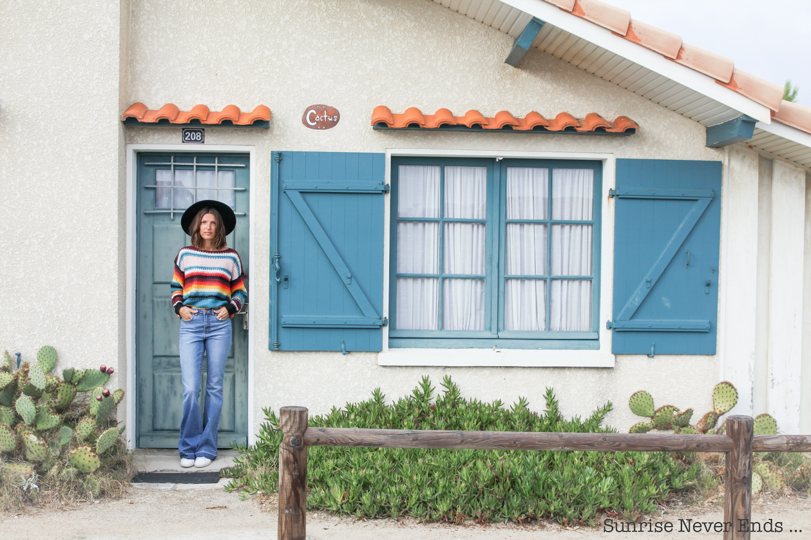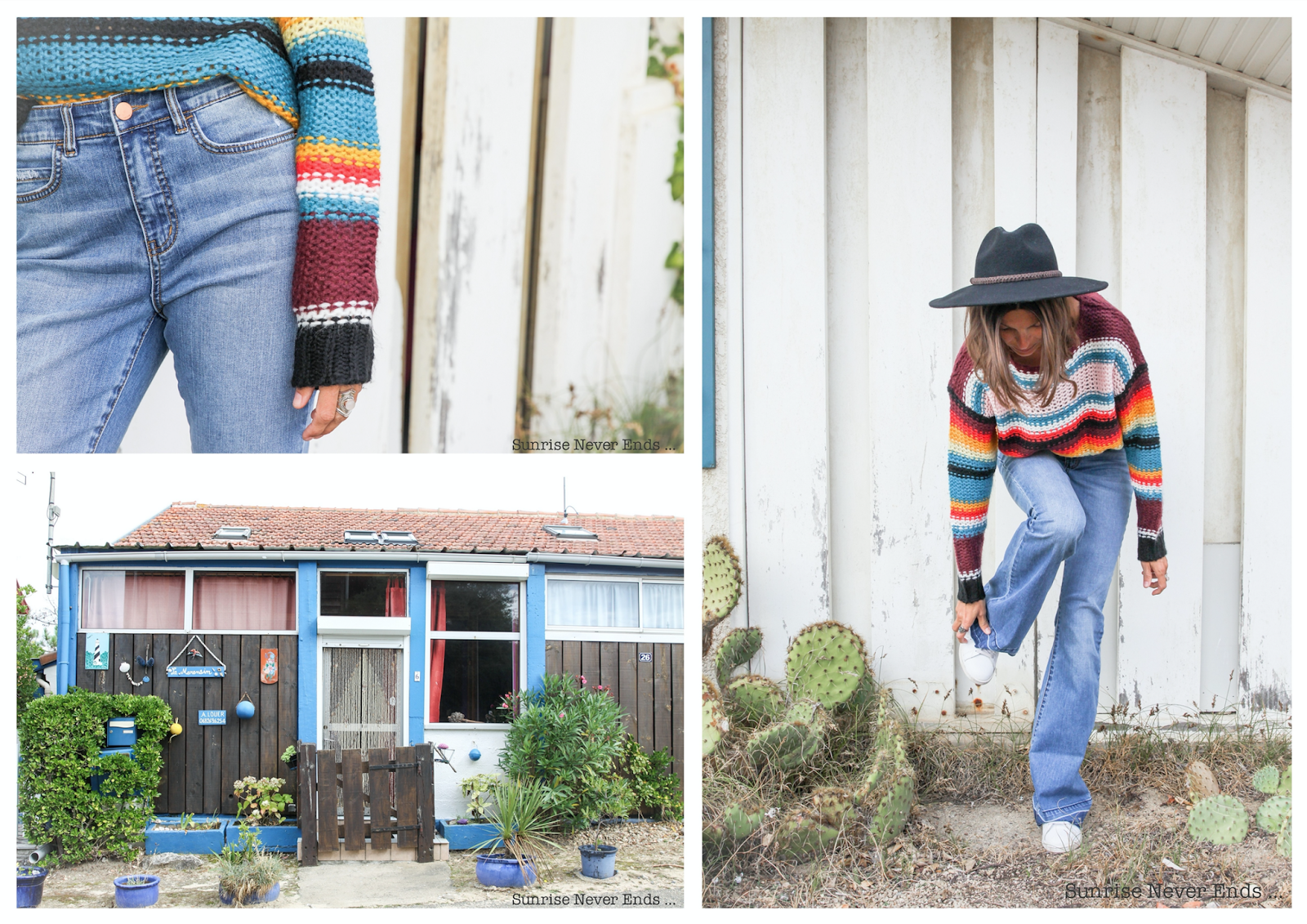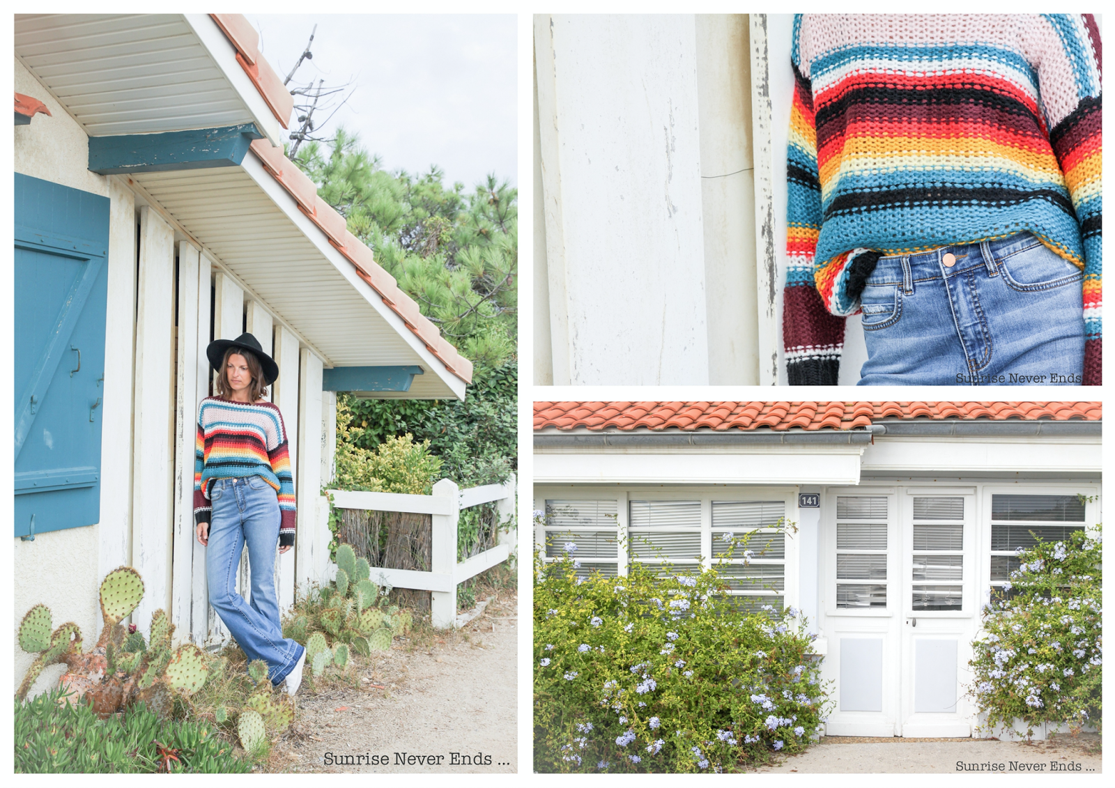 Aujourd’hui, le programme à la plage c’est atelier knitting à la boutique Billabong du centre ville … Alors en l’honneur de ce happening, j’ai eu envie de vous montrer ce pull rainbow de la collection de cet hiver … Je crois que c’est la pièce que je préfère de toute la collection tellement j’aime ses couleurs vives et vitaminées !!! Du coup, on l’a embarqué avec nous lors de notre road trip avec Julie et on a profité d’une pause à Contis Plage pour vous le photographier, porté avec un jean flare, l’incontournable 70’s de cet hiver …