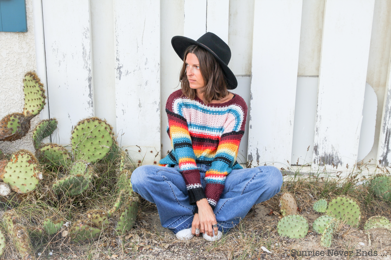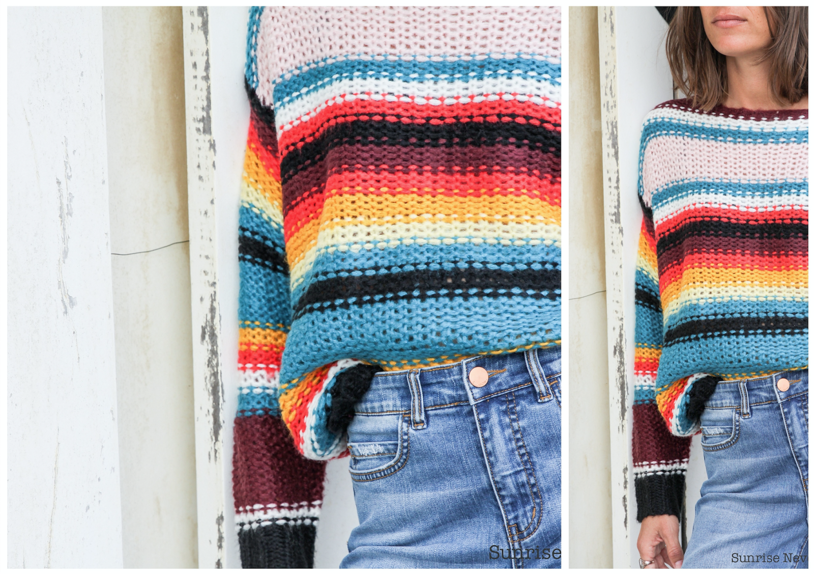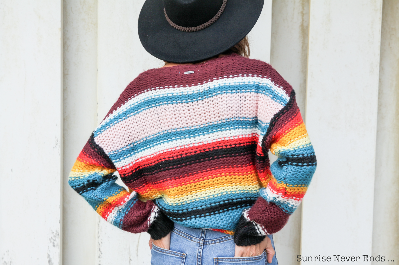 Aujourd’hui, le programme à la plage c’est atelier knitting à la boutique Billabong du centre ville … Alors en l’honneur de ce happening, j’ai eu envie de vous montrer ce pull rainbow de la collection de cet hiver … Je crois que c’est la pièce que je préfère de toute la collection tellement j’aime ses couleurs vives et vitaminées !!! Du coup, on l’a embarqué avec nous lors de notre road trip avec Julie et on a profité d’une pause à Contis Plage pour vous le photographier, porté avec un jean flare, l’incontournable 70’s de cet hiver …